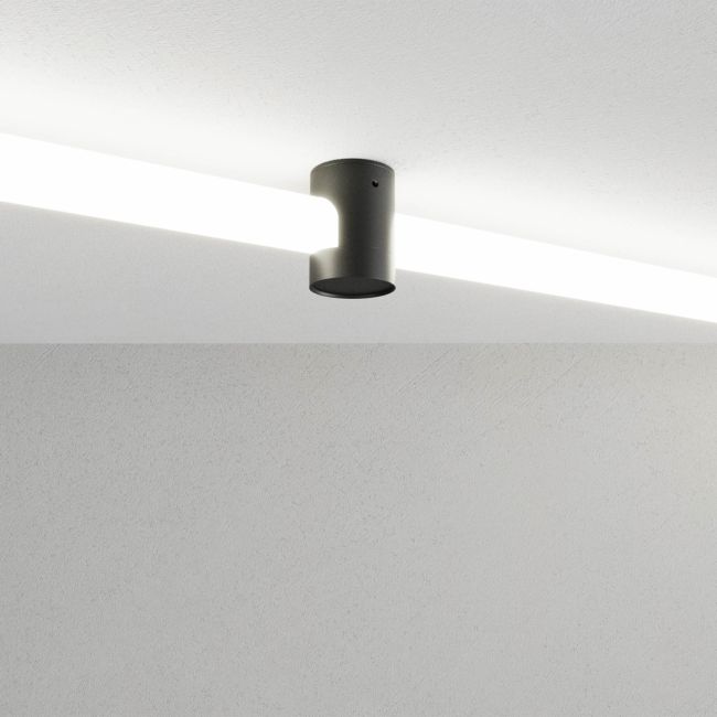 Element pentru trecerea și fixarea benzilor tubulare cu LED-uri din structurile XLOOP de 18 mm pe tavan sau perete. Realizat din aluminiu turnat sub presiune, cu element de montaj și capac de fixare, vopsite electrostatic negru cu finisaj sablat.