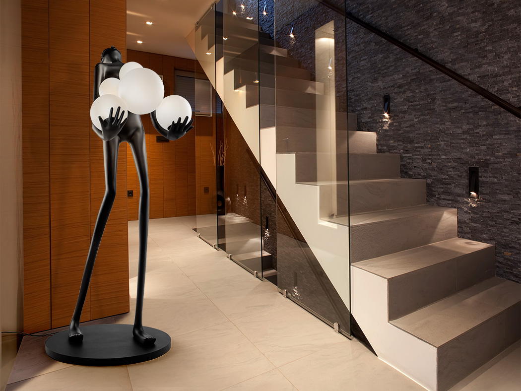 Figurină confecționată din fibră de sticlă și rășină poliesterică, cu finisaj negru mat și abajururi sferice din acrilic cu finisaj alb opal mat.