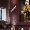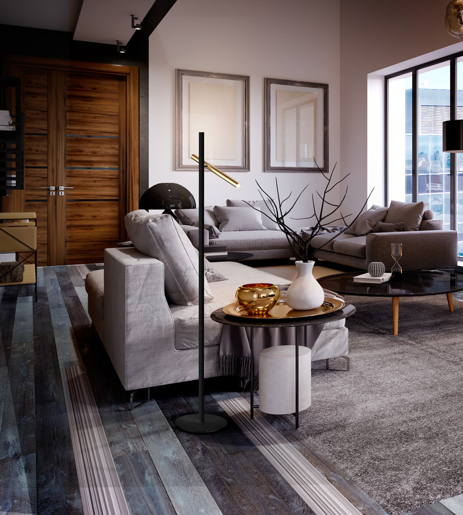 Lampadar de interior cu două surse de lumină LED. Fabricat din metal, finisat în auriu strălucitor și negru mat. Difuzor acrilic opal. LED 10W, 900 lm, 3000K.