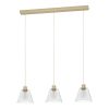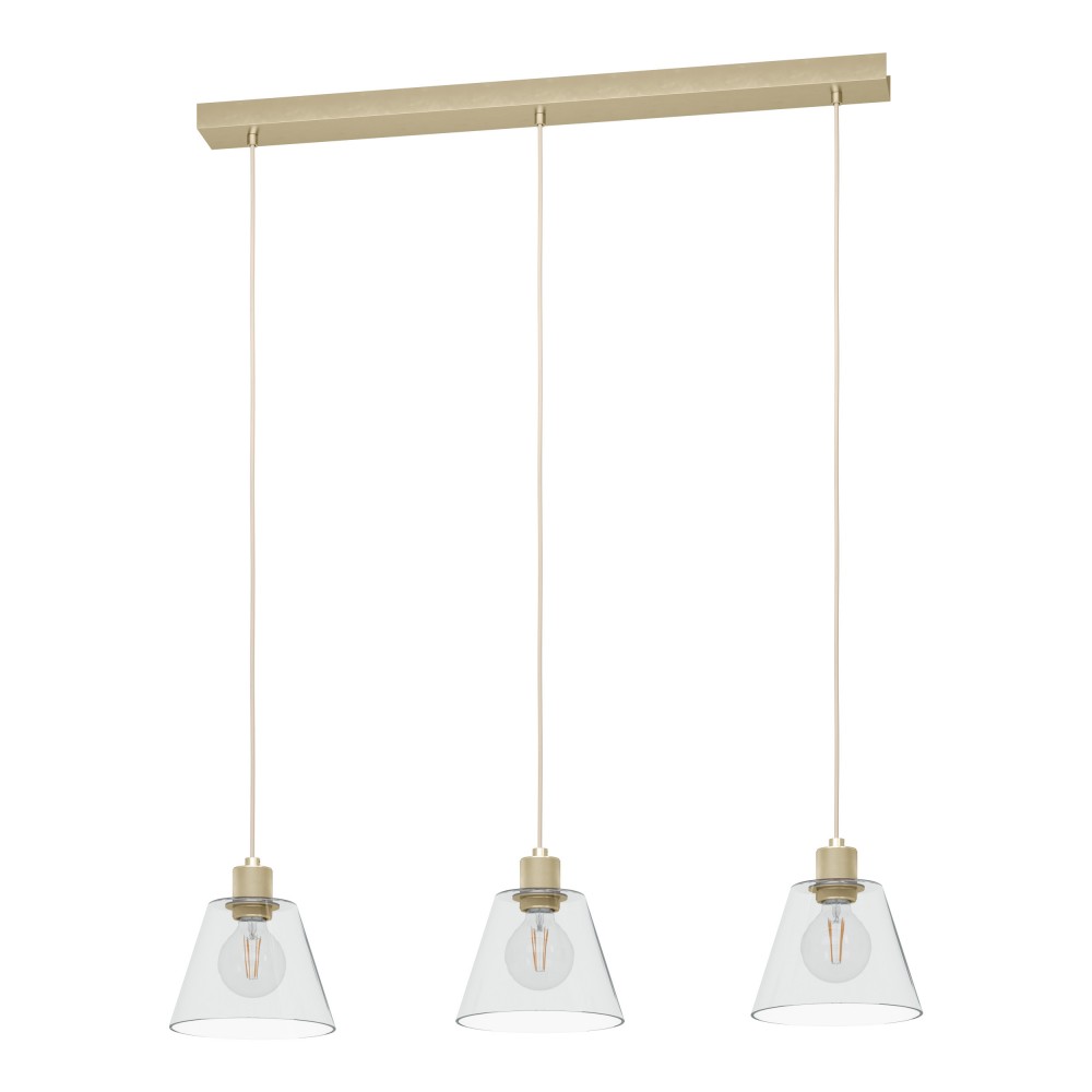 Lampa suspendată COPLEY are trei abajururi conice din sticlă transparentă, fiecare asociat cu un suport decorativ din metal auriu. Suportul lung de tavan realizat din metal auriu și cabluri textile de aceeași culoare completează aspectul luminii. Lampa cu pandantiv se integrează perfect în interioarele moderne și este o soluție elegantă de iluminat pentru sufragerie sau peste o masă lungă din sufragerie. Becurile cu filament din imagine nu sunt incluse. Produsul are suporturi de lampa E27 si necesita 3 x becuri E27.
