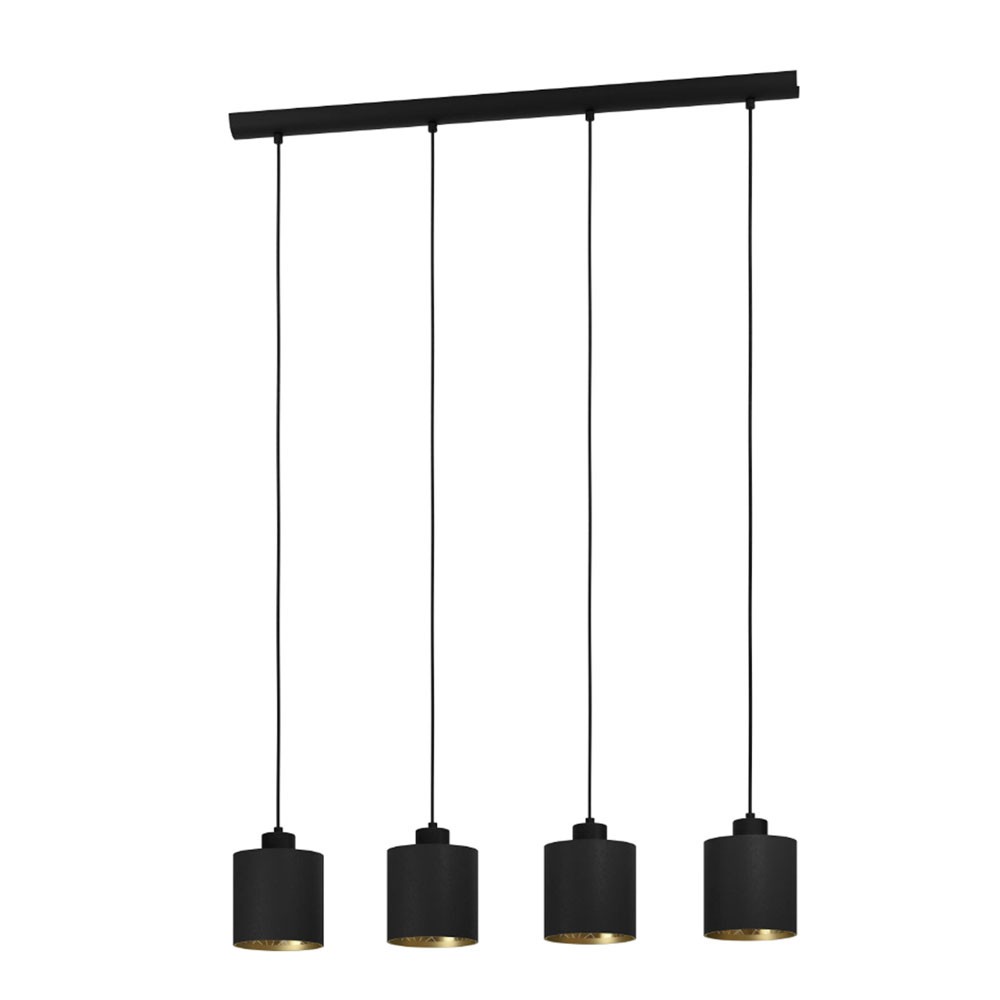 Lampa suspendată ZARAGOZA are patru abajururi rotunde din material negru, cu finisaj interior auriu. Modelul geometric și floral complicat de pe suprafețele interioare ale abajururilor conferă luminii un aspect distinctiv. Lampa cu pandantiv este un plus minunat pentru orice interior modern și oferă un iluminat primitor în camera de zi sau sufragerie deasupra mesei. Becurile nu sunt incluse. Produsul are suporturi de lampă E27 și necesită becuri E27.