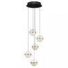 Lustra moderna pentru interior, dimabila, cu structura din metal vopsit negru mat si dispersoare duble din acril transparent si sticla alba tip alabastru, cu inele decorative din metal finisat alama.