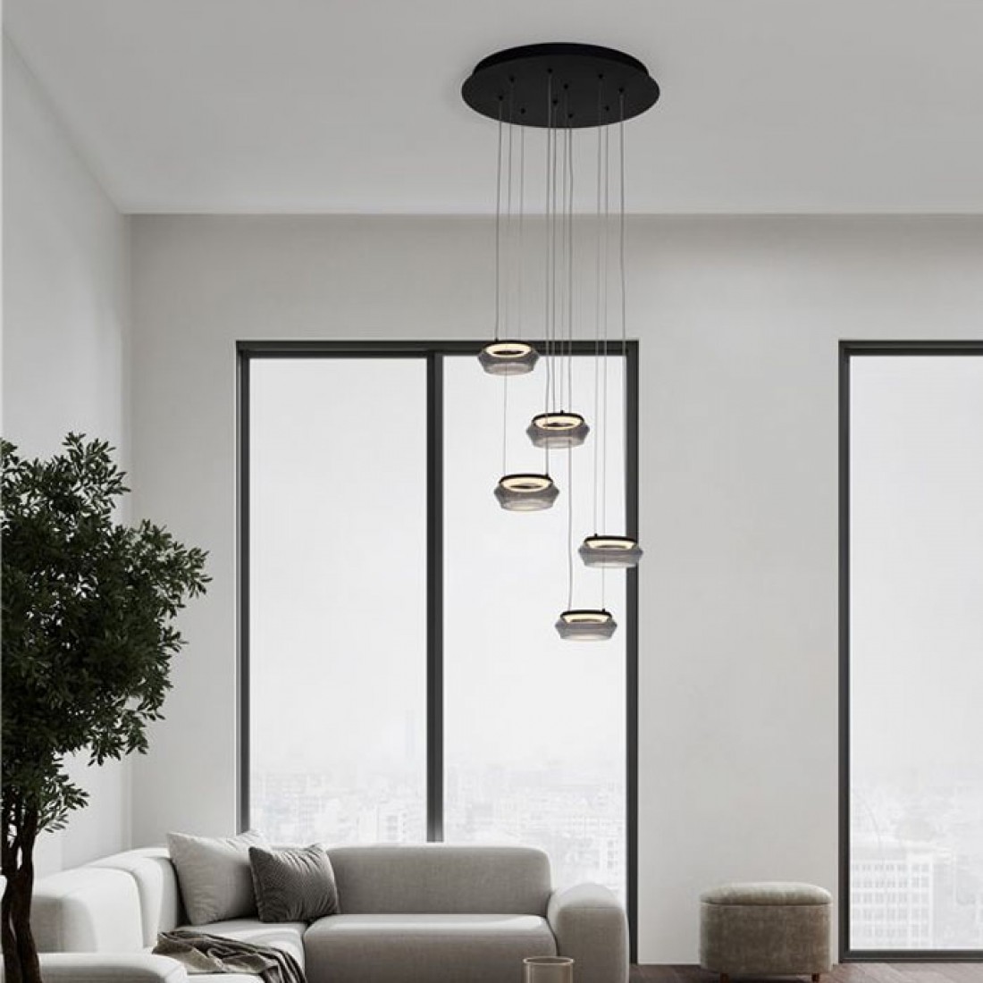 Lustra moderna pentru interior, cu structura din metal vopsit negru mat si abajururi din sticla suflata fumurie.