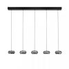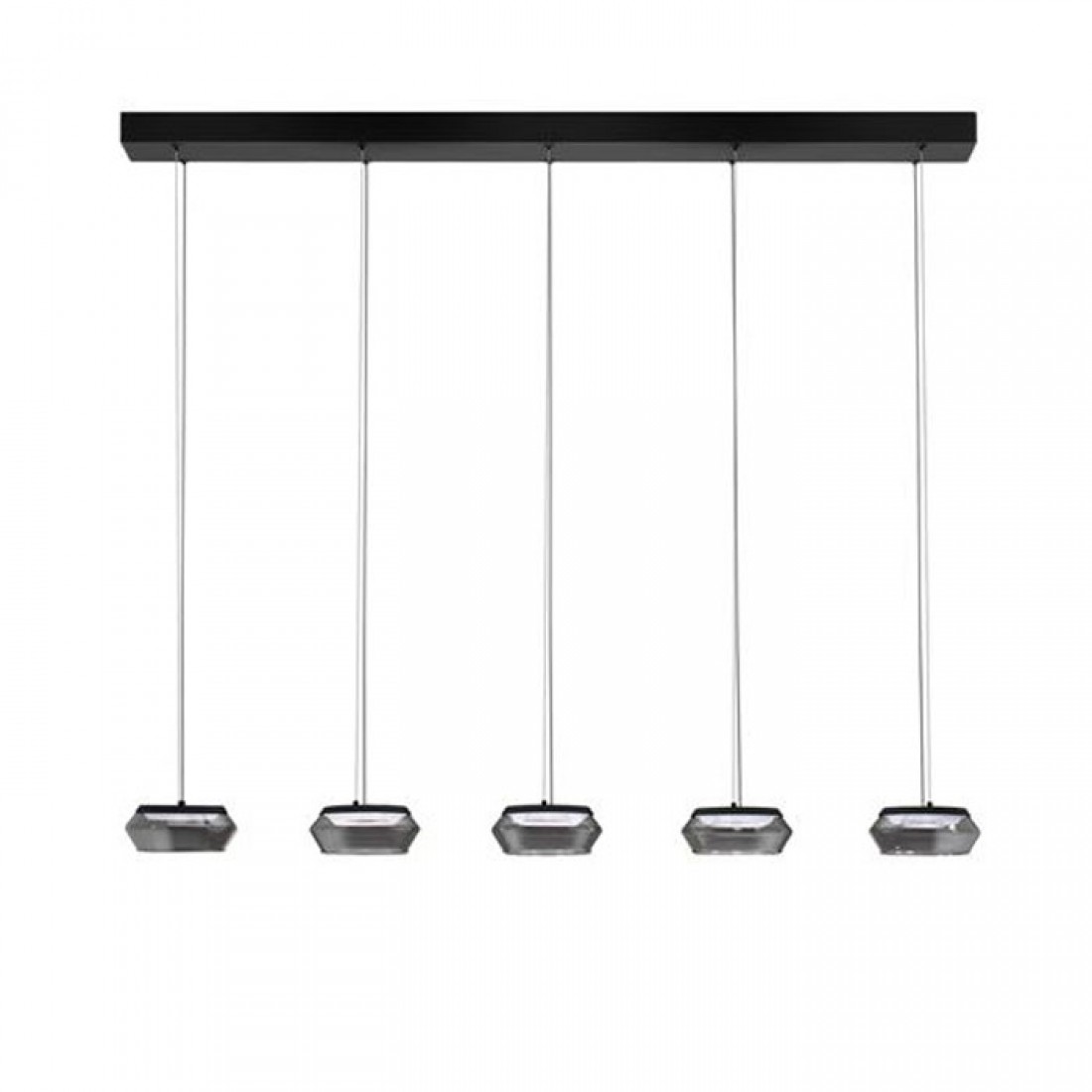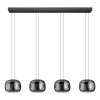 Lustra moderna pentru interior, cu structura din metal vopsit negru mat si abajururi din sticla suflata fumurie.