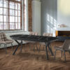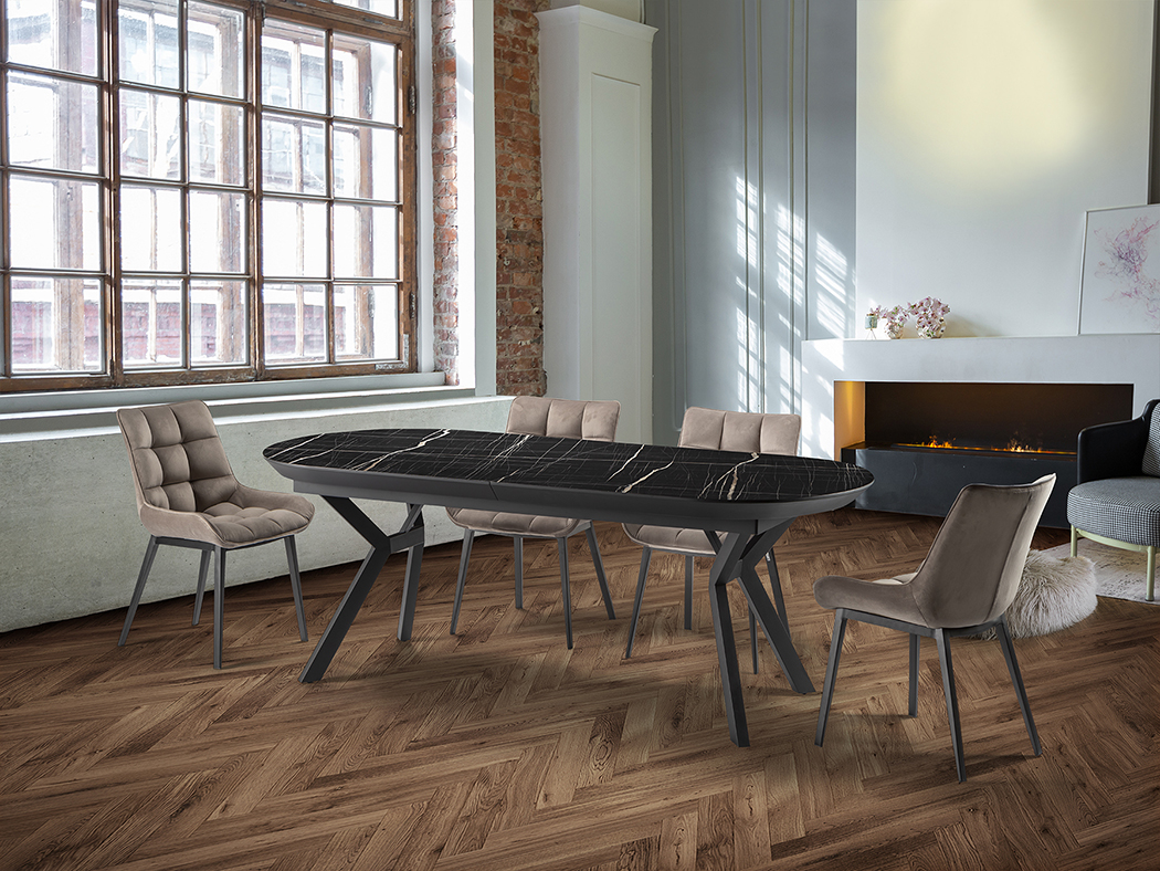 Masă de dining extensibilă până la 285 cm, cu structură metalică finisată negru mat și blat din MDF cu suprafață melaminată de înaltă rezistență, finisaj lucios tip marmură neagră și margini negre mate.