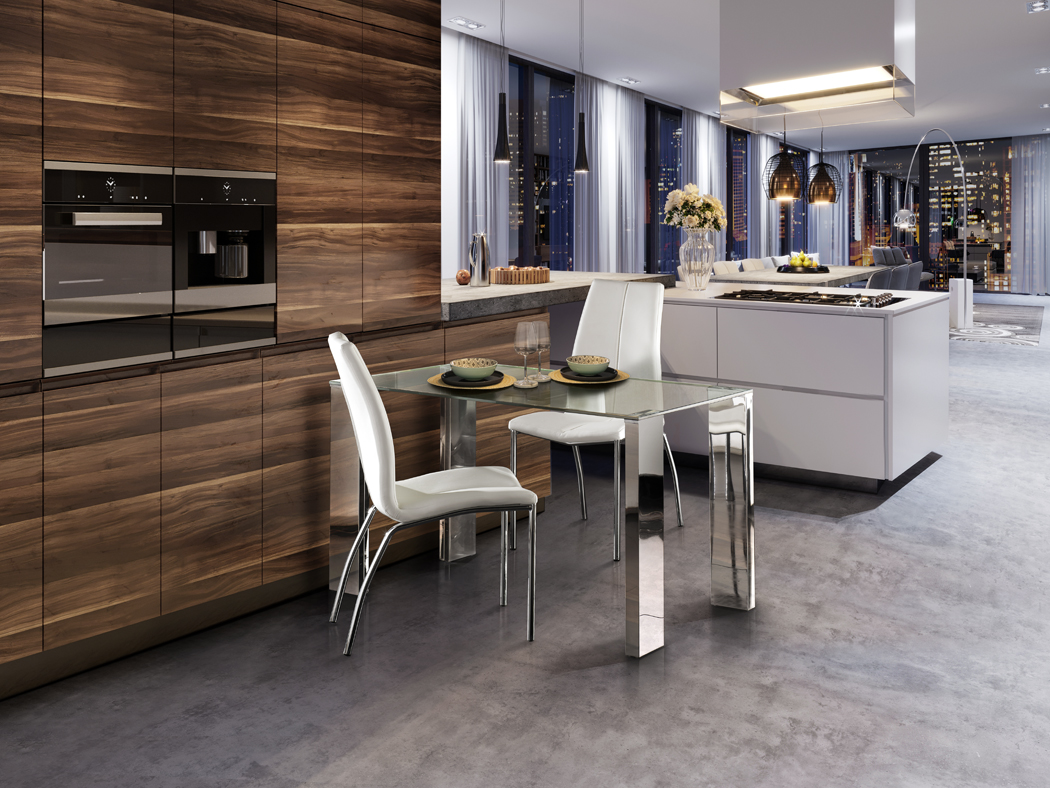Masă de dining realizată din oțel inoxidabil și sticlă, cu cadru interior al picioarelor din MDF. Blat din sticlă securizată transparentă, grosime 12 mm, dimensiuni 120×75 cm.