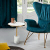 Măsuță laterală din oțel inoxidabil cu finisaj auriu, bază din marmură neagră și blat din sticlă securizată cu finisaj ce imită marmura neagră.
