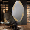 Oglindă decorativă cu panouri fațetate și elemente grafice realizate cu foiță de argint. Spate din MDF lăcuit negru. Poate fi agățată în poziție verticală sau orizontală.