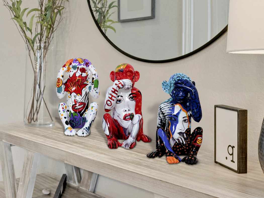 Set de 3 figurine de maimuțe, confecționate din polirășină cu decor graffiti.