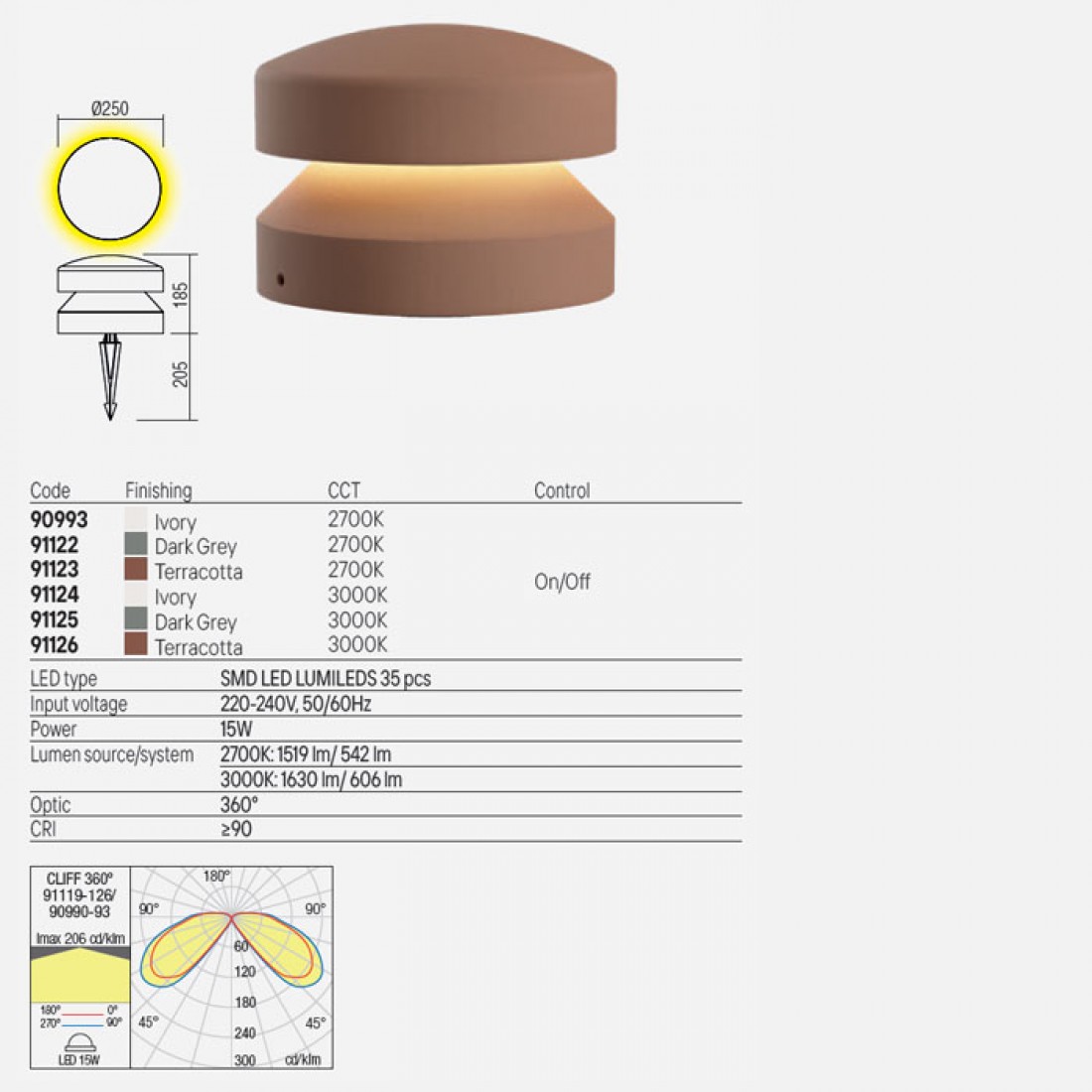Stalp exterior Cliff, ivoar, LED, 15W, 606 lumeni, alb cald 3000K, IP65, D.25 cm, 91124