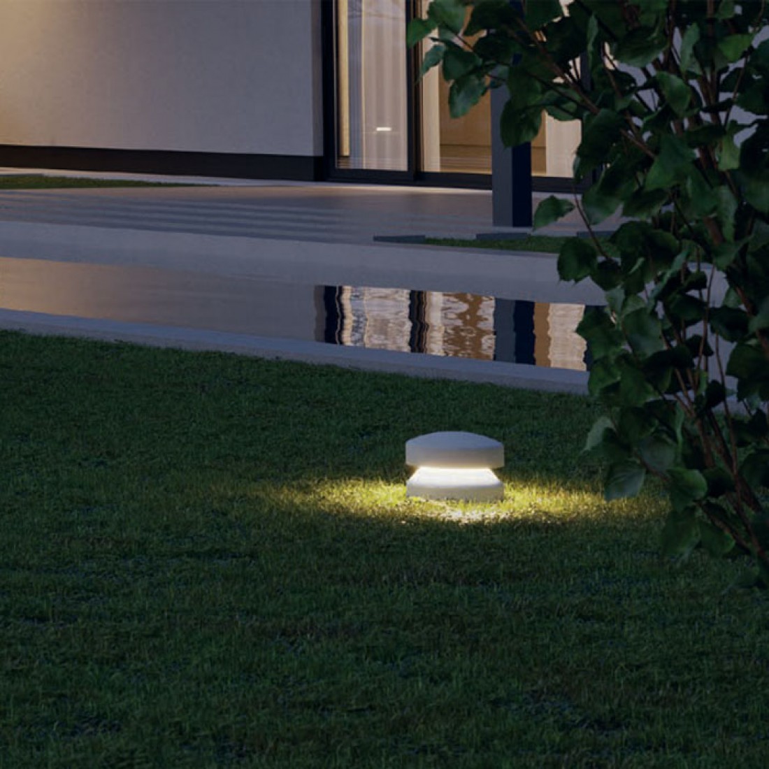 Stâlpișor modern pentru exterior, structură din beton culoare ivoar, radiator din aluminiu rezistent la sare 5083, componente și șuruburidin inox AISI 316t, dispersor din sticlă satinată.
