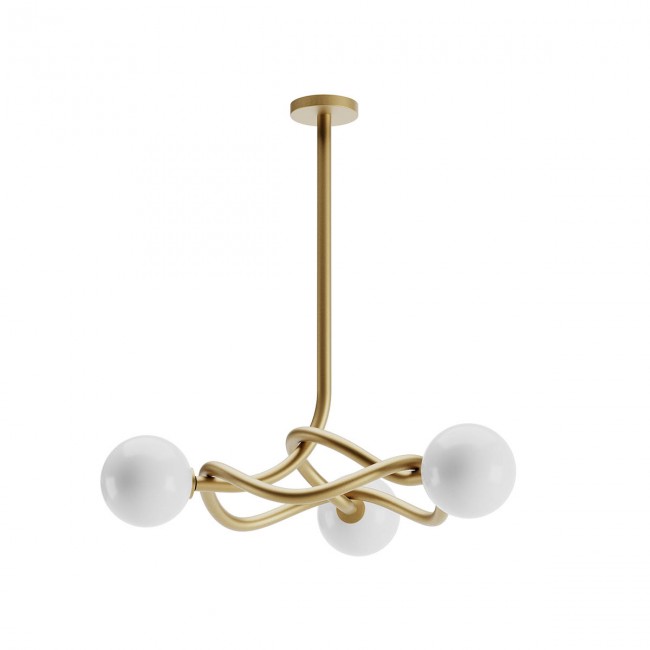 Suspensie pentru interior, structură din metal finisat auriu mat, abajururi din sticlă suflată alb opal.