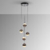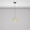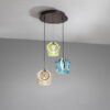 Suspensie de interior cu 3 surse de lumină, realizată din aluminiu periat cu finisaj bronz închis. Abajururi de sticlă nuanța șampanie, verde și albastru, cu inel LED interior și difuzor din silicon. LED 18W, 483 lm, 3000K. Este furnizată cu dibluri basculante, pentru a îmbunătăți fixarea pe tavan. Abajururile de sticlă pot fi montate în unghi.