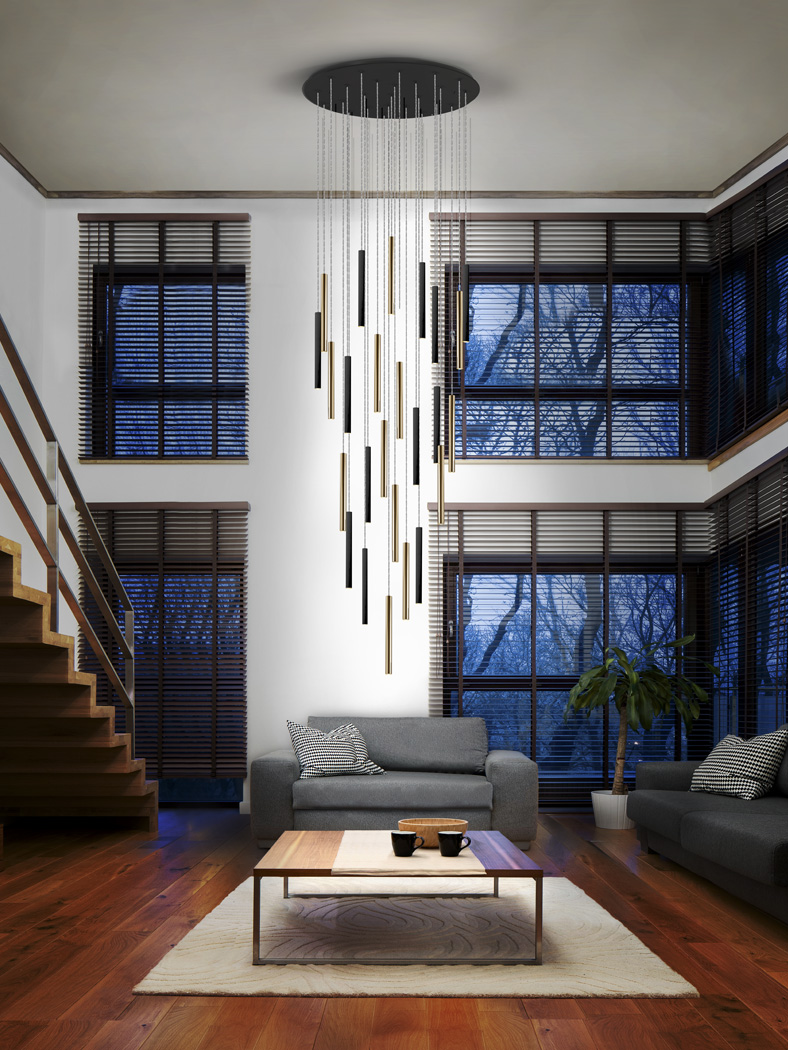 Suspensie de interior LED rotundă cu 25 de surse de lumină. Fabricat din metal, finisat în auriu și negru mat. Difuzor acrilic opal. LED 125W, 11250 lm, 3000K. Lungime maximă 300cm. Dimabil. Este furnizată cu dibluri basculante, pentru a îmbunătăți fixarea pe tavan.