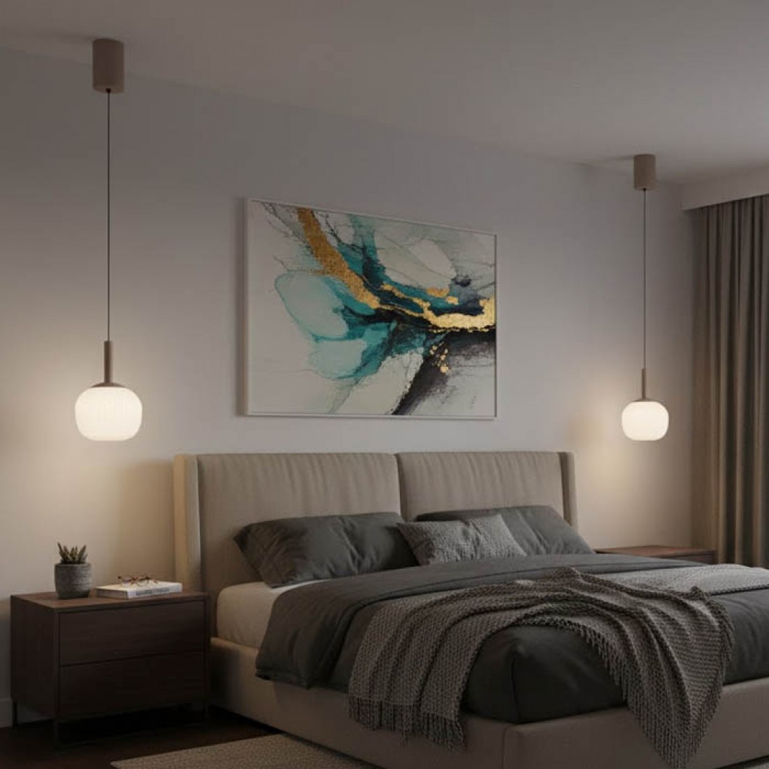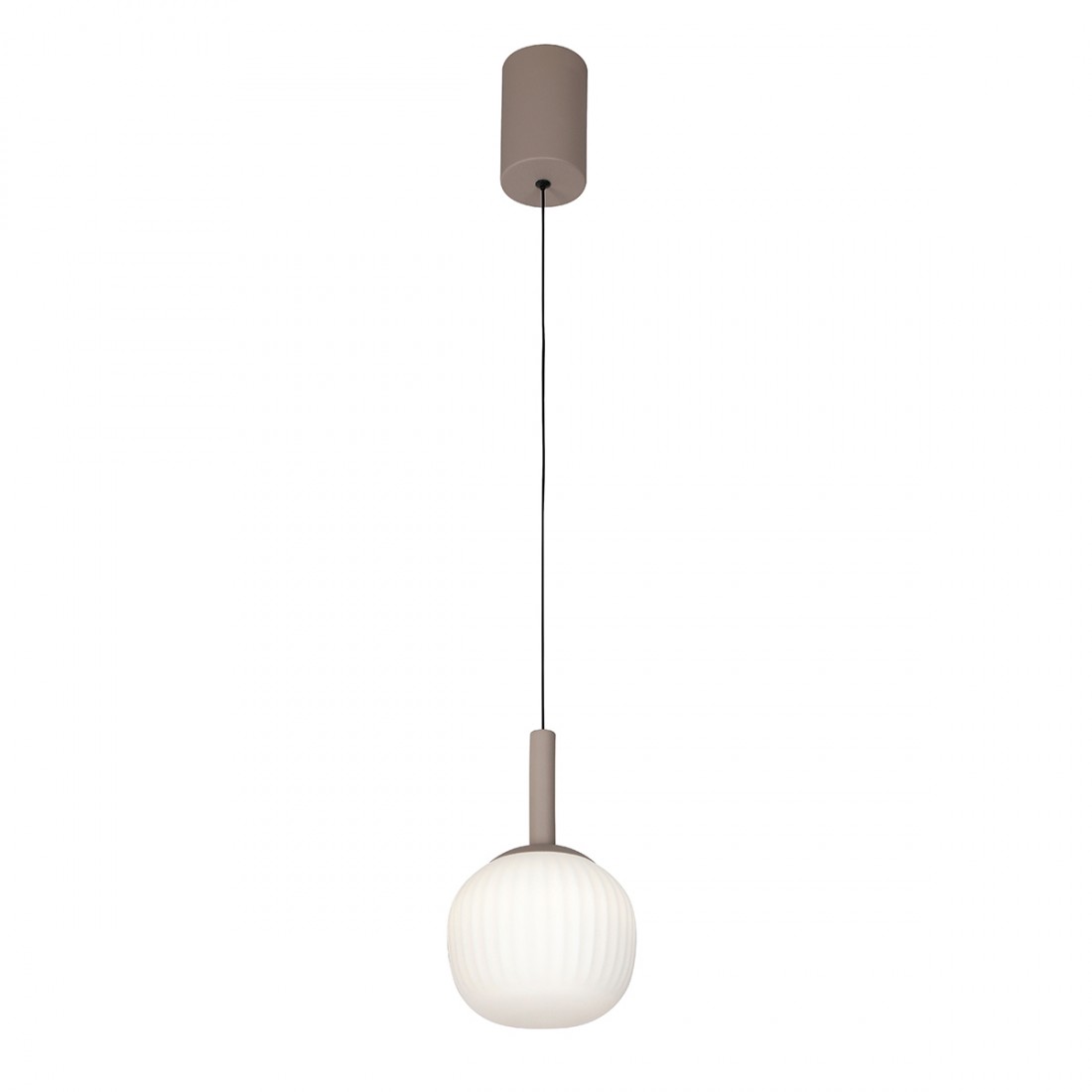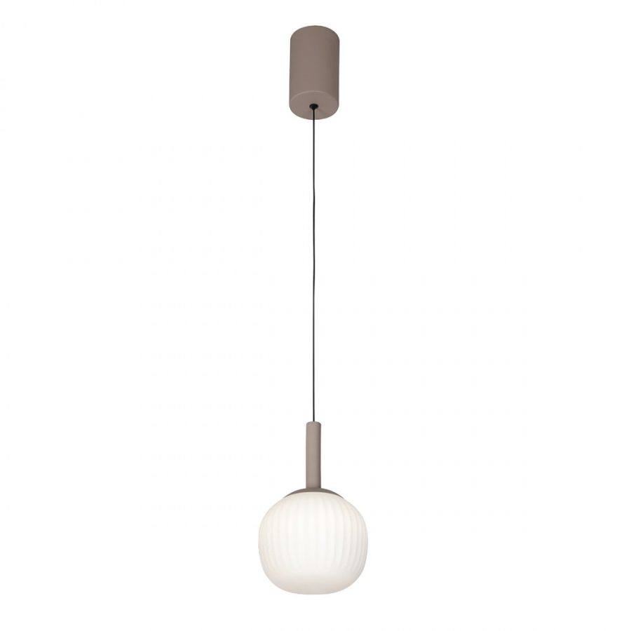 Suspensie moderna pentru interior, cu structură din metal vopsită maro mat si abajur din sticla suflata striata alb opal.