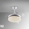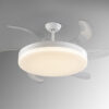 Ventilator de tavan cu sursă de lumină LED CCT dimabilă, realizat din metal cu finisaj alb mat și inel bronz. Dispune de difuzor acrilic opal și paleți retractabili din acrilic fumuriu. Motor DC invertor cu 6 viteze (153/173/190/201/200/240 rpm) și debit de aer variabil (3000/4000/5500/6500/7500/9500 m³/h). Include funcție timer, sens de rotație inversabil și sistem anti-balans pentru montaj stabil. Nivel de zgomot între 37 și 42 dB. Telecomandă inclusă. Lumina LED are 36W, 1830 lm și temperatură de culoare reglabilă între 3000 și 6000 K. Ventilatorul are elice cu 4 paleți, diametru extins de 100 cm și rază de acțiune de 180 cm (măsurată la 140 cm sub ventilator). Motor ventilator 38W. Disponibil și în versiunea 110V.