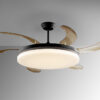 Ventilator de tavan cu sursă de lumină LED CCT dimabilă, realizat din metal cu finisaj negru mat și inel placat cu foiță de aur. Dispune de difuzor acrilic opal și paleți retractabili din acrilic fumuriu. Motor DC cu 6 viteze și funcție de rotație inversă. Temperatura de culoare a luminii este reglabilă. Include funcție timer. Motor DC de 38W, cu viteze între 153 și 240 rpm și debit de aer între 3000 și 9500 m³/h. Nivel de zgomot între 37 și 42 dB. Telecomandă inclusă. Lumina LED are 36W, 1830 lm și temperatură reglabilă între 3000 și 6000 K. Ventilatorul are 4 paleți și diametru extins de 100 cm, cu rază de acțiune de 180 cm (măsurată la 140 cm sub ventilator). Disponibil și în versiunea 110V.